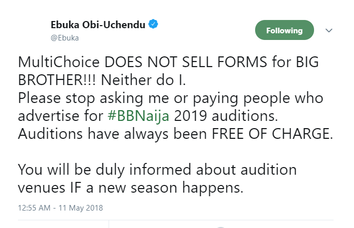 Please stop asking me or paying people who advertise for #BBNaija 2019 auditions. Auditions have always been FREE OF CHARGE.You will be duly informed about audition venues IF a new season happens.”